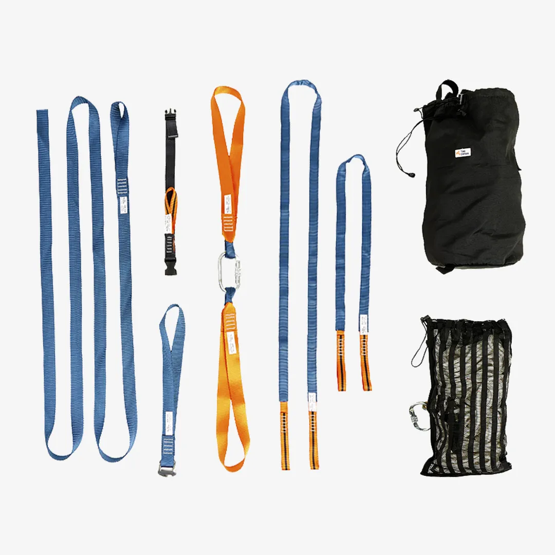 Kit para ancoragem em escada. Inclui fitas em diversos comprimentos, longarina, corda poliamida 12 mm (22m), mosquetão oval 25 kN e bolsa.