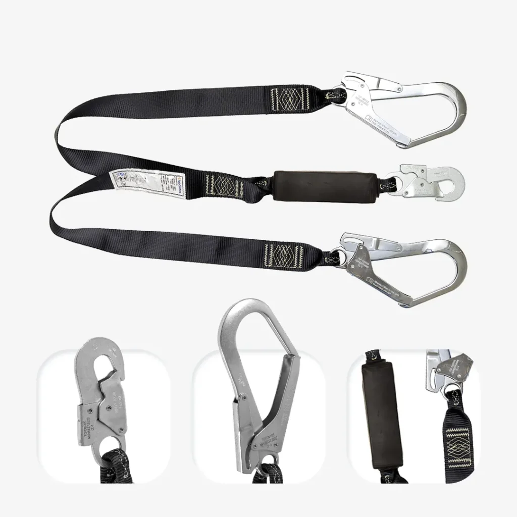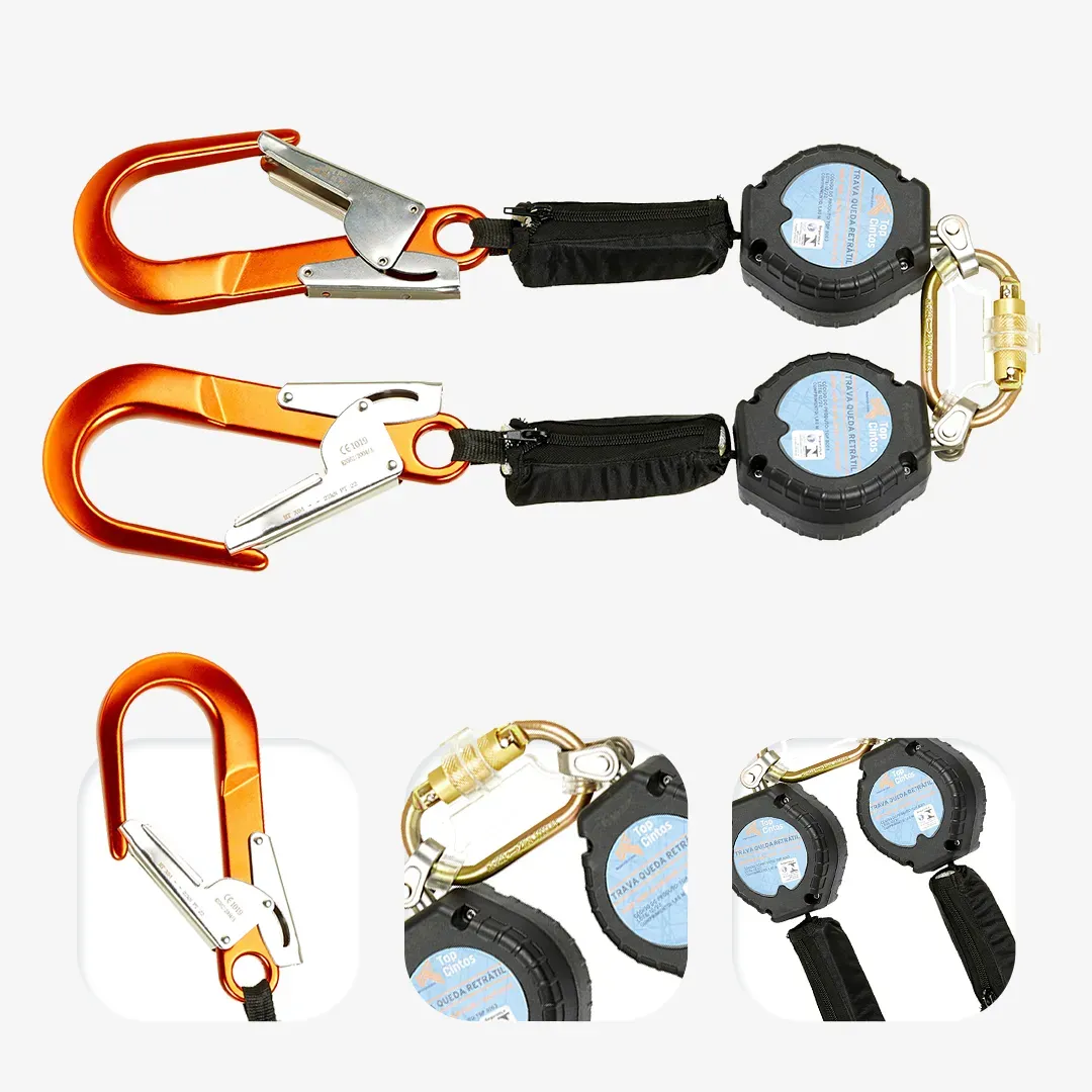 Sistema duplo com extensão e fita Dyneema, em caixa de polímero. Inclui absorvedor de energia e dois conectores: classe A (duralumínio) e classe B (aço).