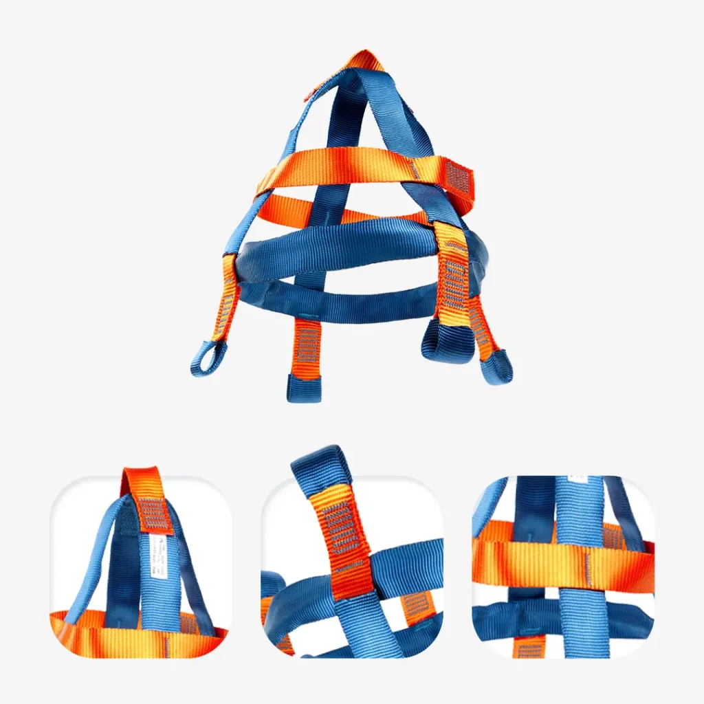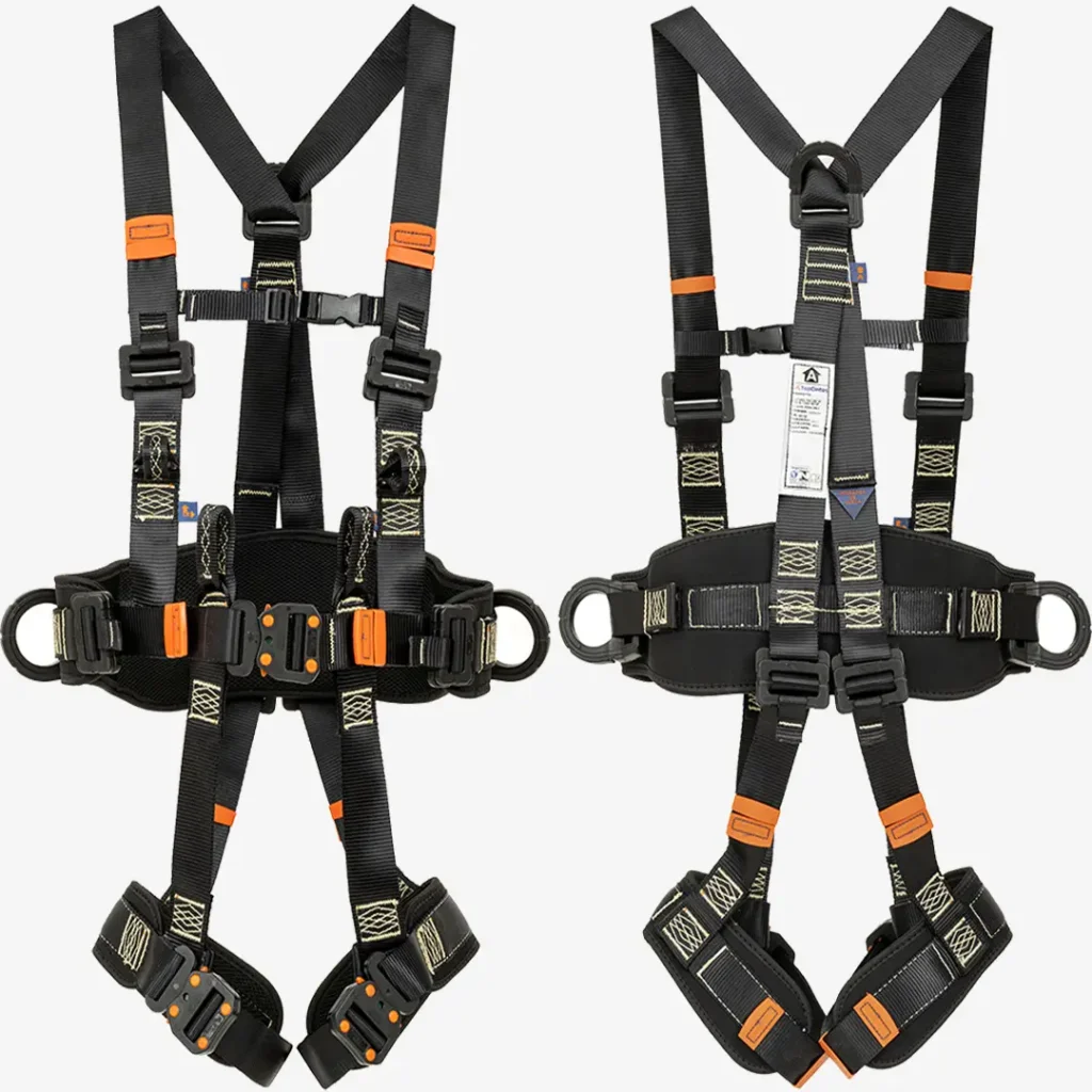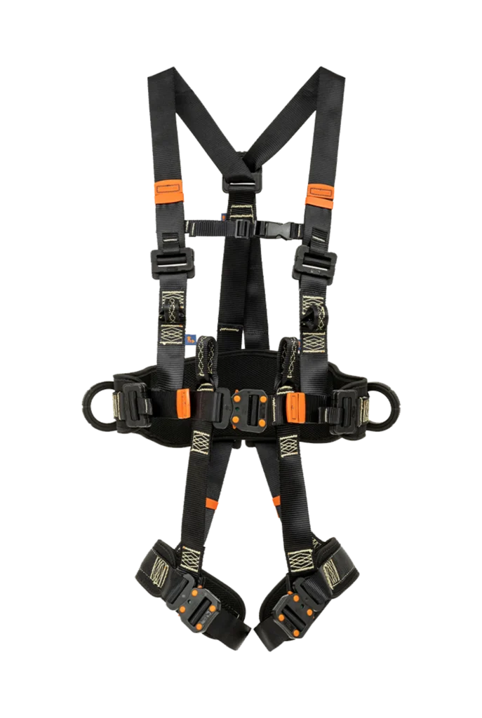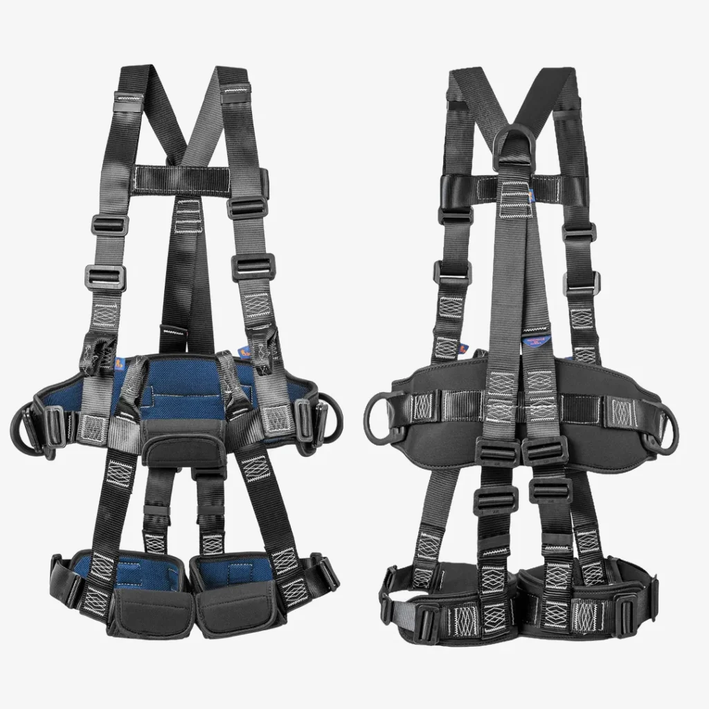 Possui 5 fivelas duplas para ajuste em peitoral, coxas e cintura. Também pode conter 2 pontos opcionais para espaço confinado nos ombros e 2 alças nas laterais.