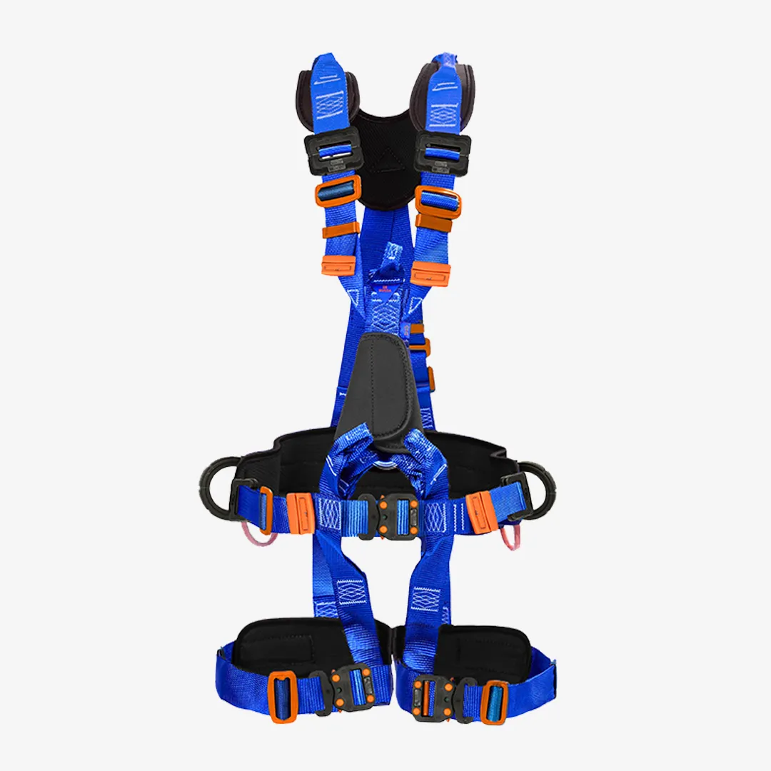 Modelo desenvolvido para conforto e estabilidade, com almofadas na cintura e coxas. Inclui 5 fivelas duplas em aço e engate peitoral simultâneo para retenção de queda.