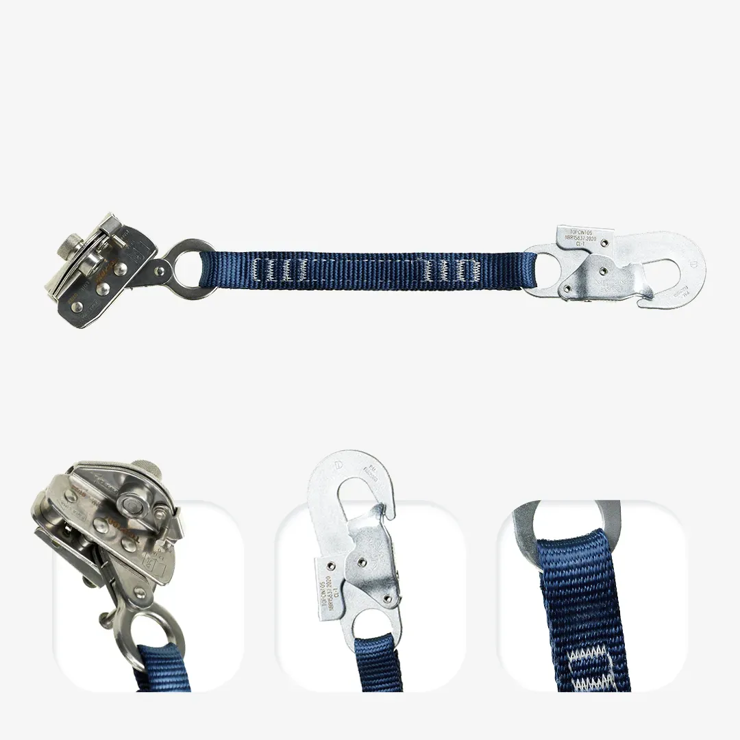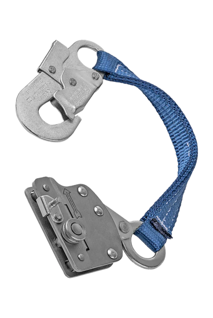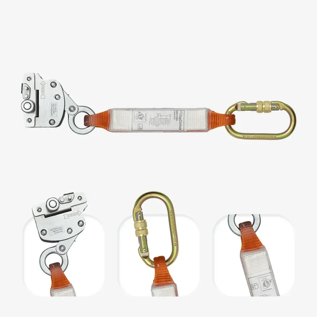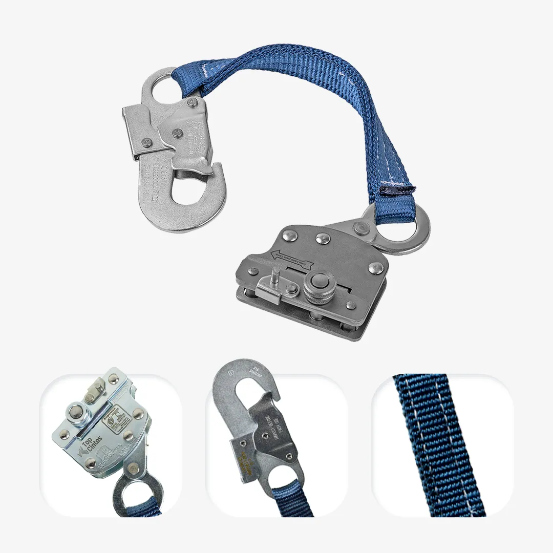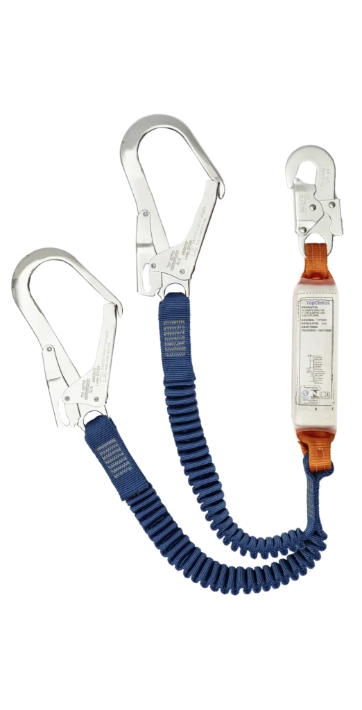 Modelo em aço carbono e indicado para corda de poliamida 12 mm. Possui conector classe B (19±3 mm) e absorvedor de energia em fita de poliéster 35±1 mm.