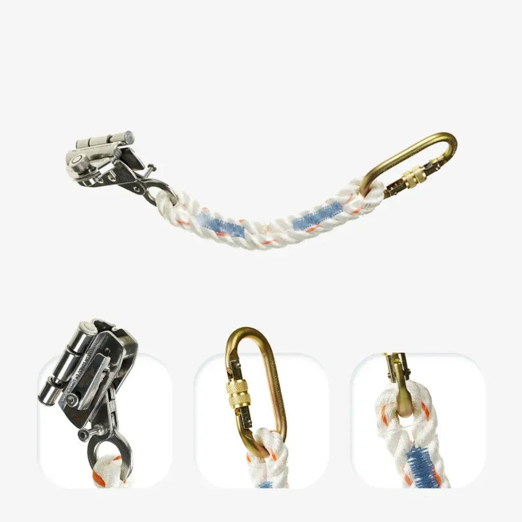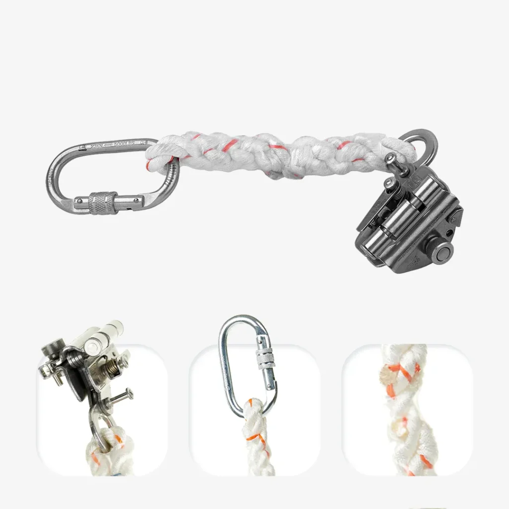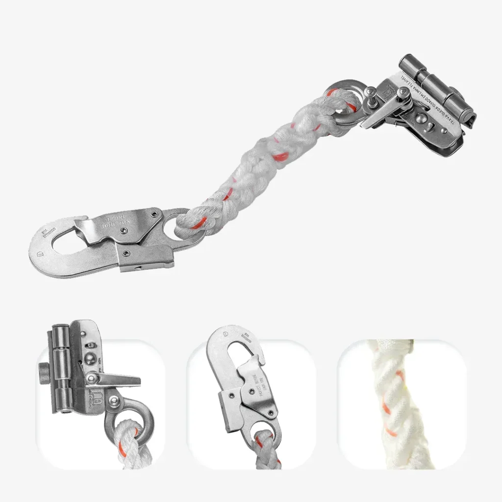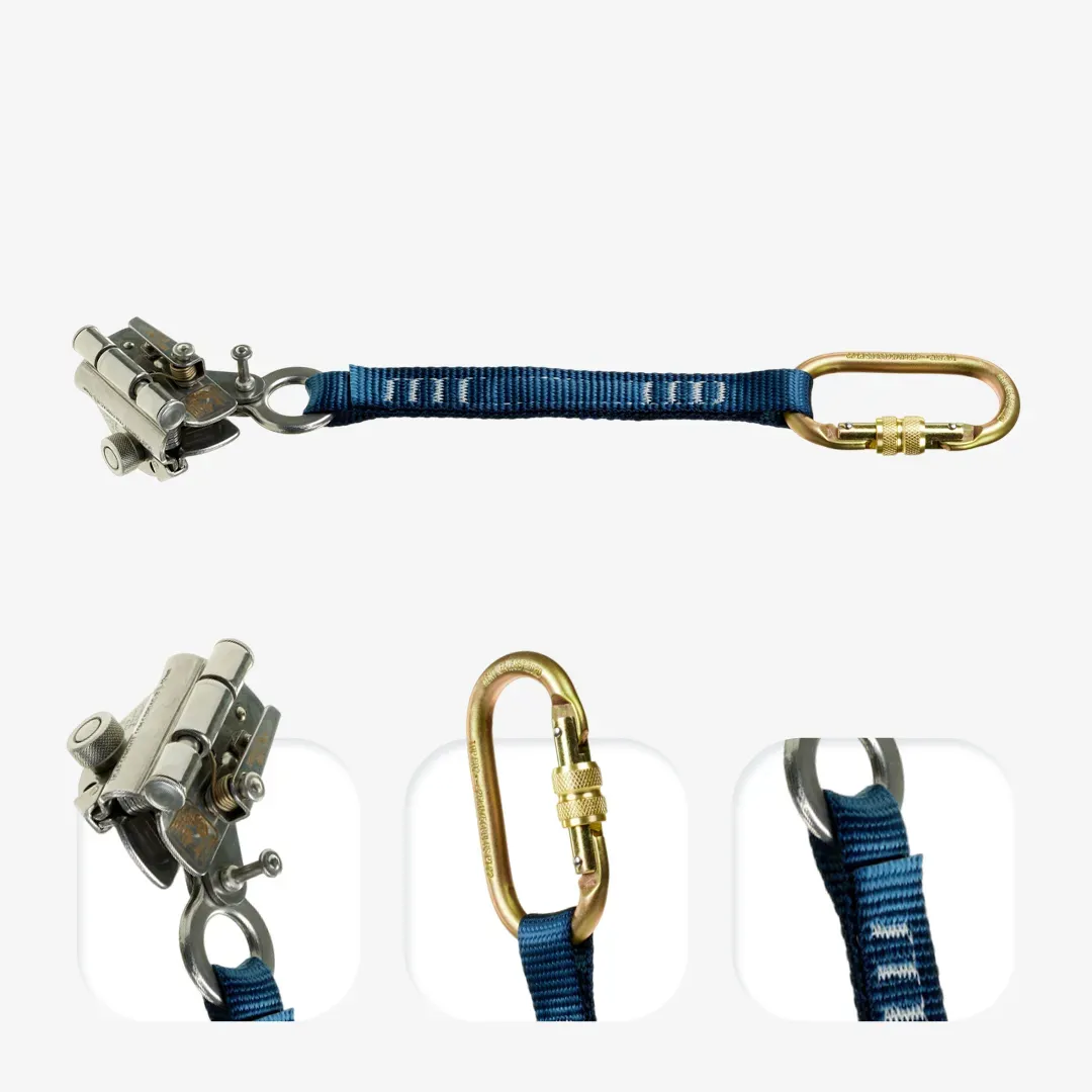 Dispositivo em aço inox para corda 12 mm, com mosquetão oval para engate prático. Acompanha extensor em fita 25±1 mm e conector classe B (19±3 mm).