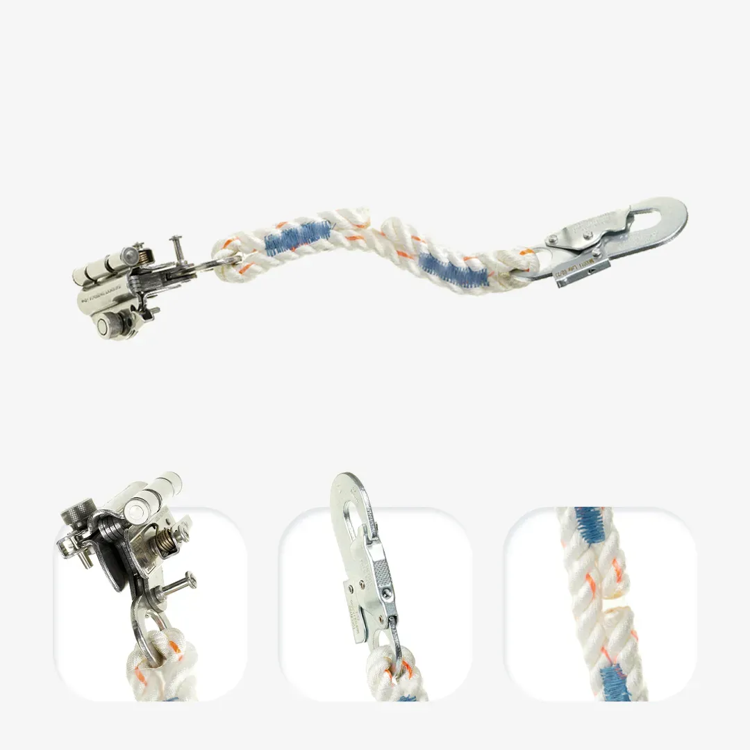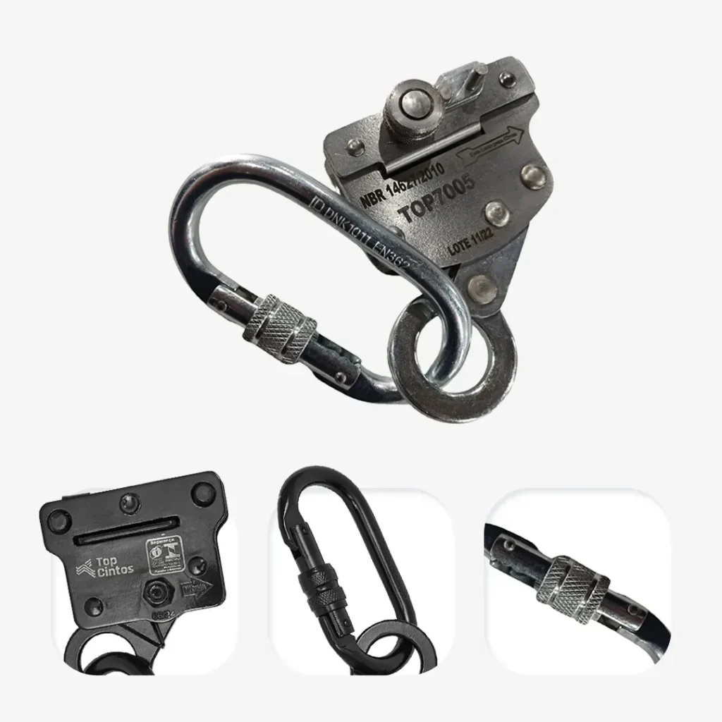 Dispositivo deslizante guiado para linha rígida, indicado para cabo de aço 8 mm. Inclui mosquetão classe B em aço, com abertura 19±3 mm.