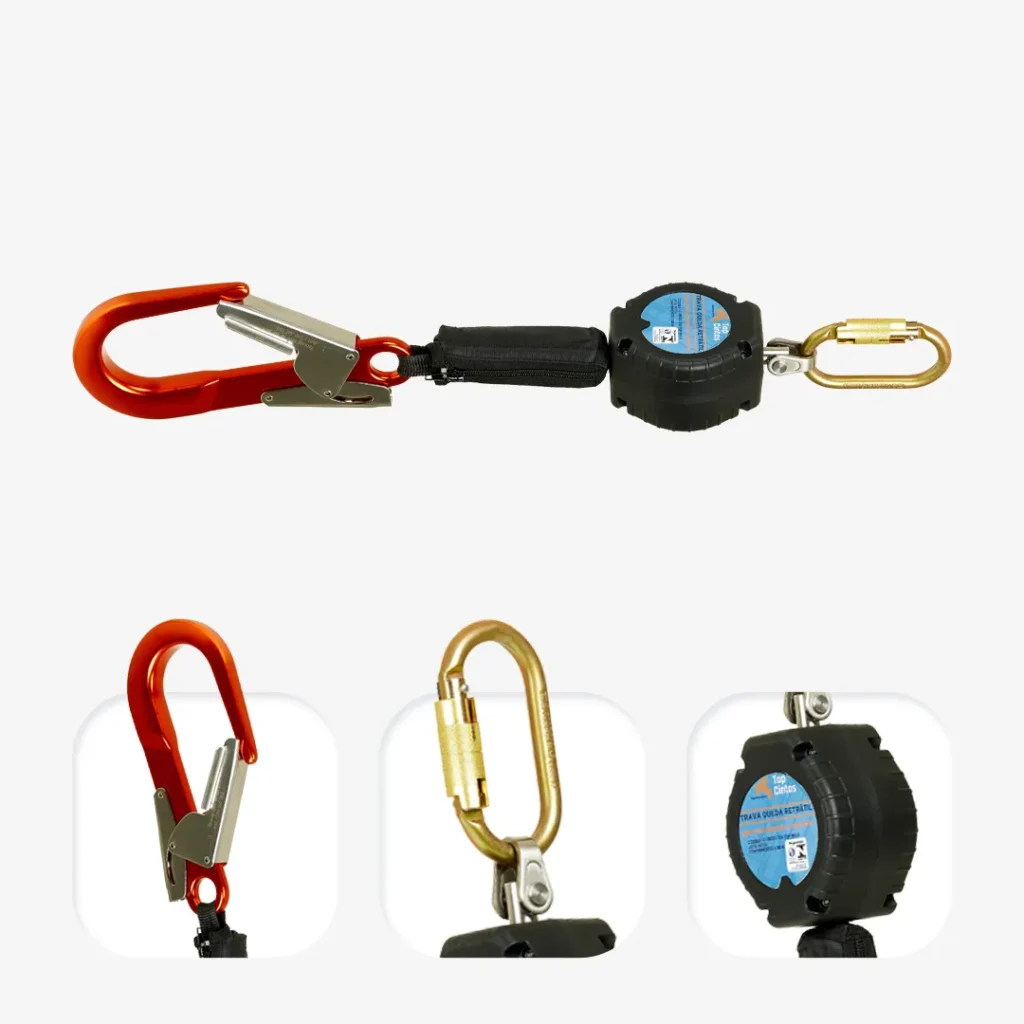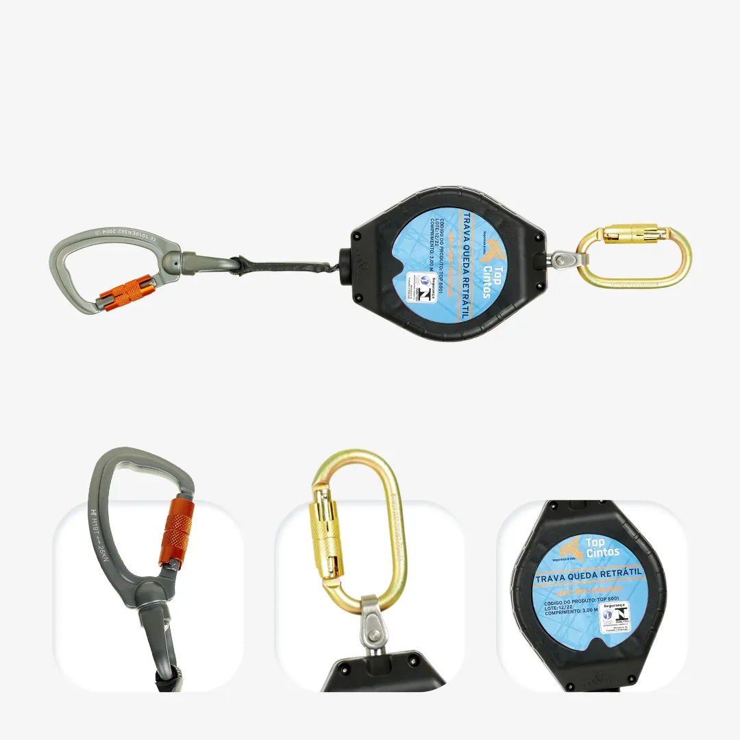 Modelo com sistema retrátil, caixa em polímero e fita Dyneema com alcance de 3 metros. Também inclui conector classe T em duralumínio e classe B em aço.