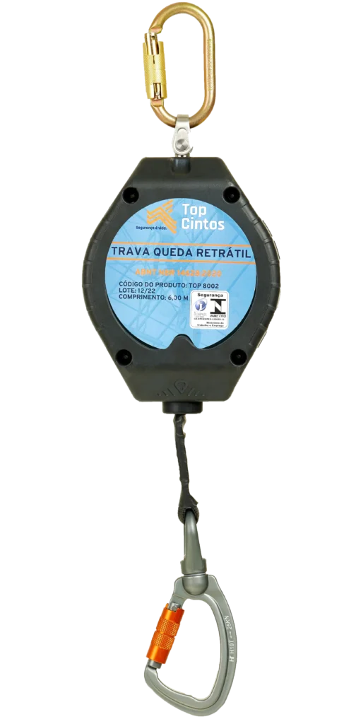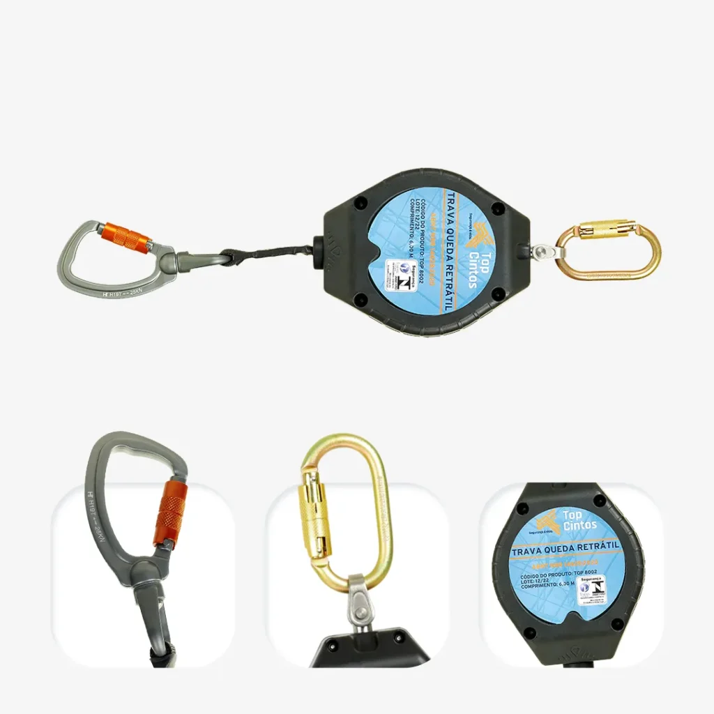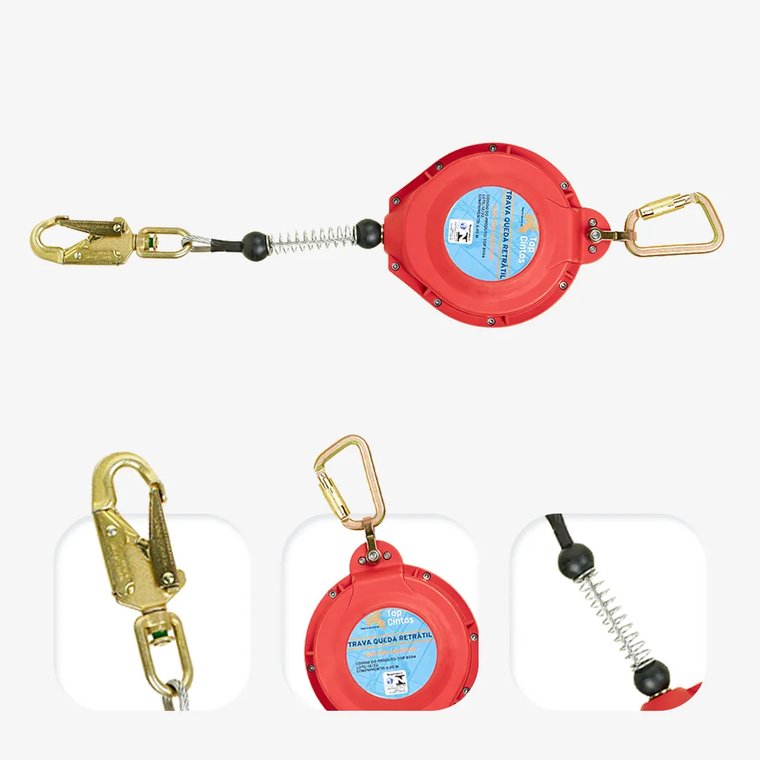 Ideal para aplicações com maior raio de movimentação, com fita retrátil de 6 metros. Contém estrutura em polímero e engates seguros: classe T e classe B.